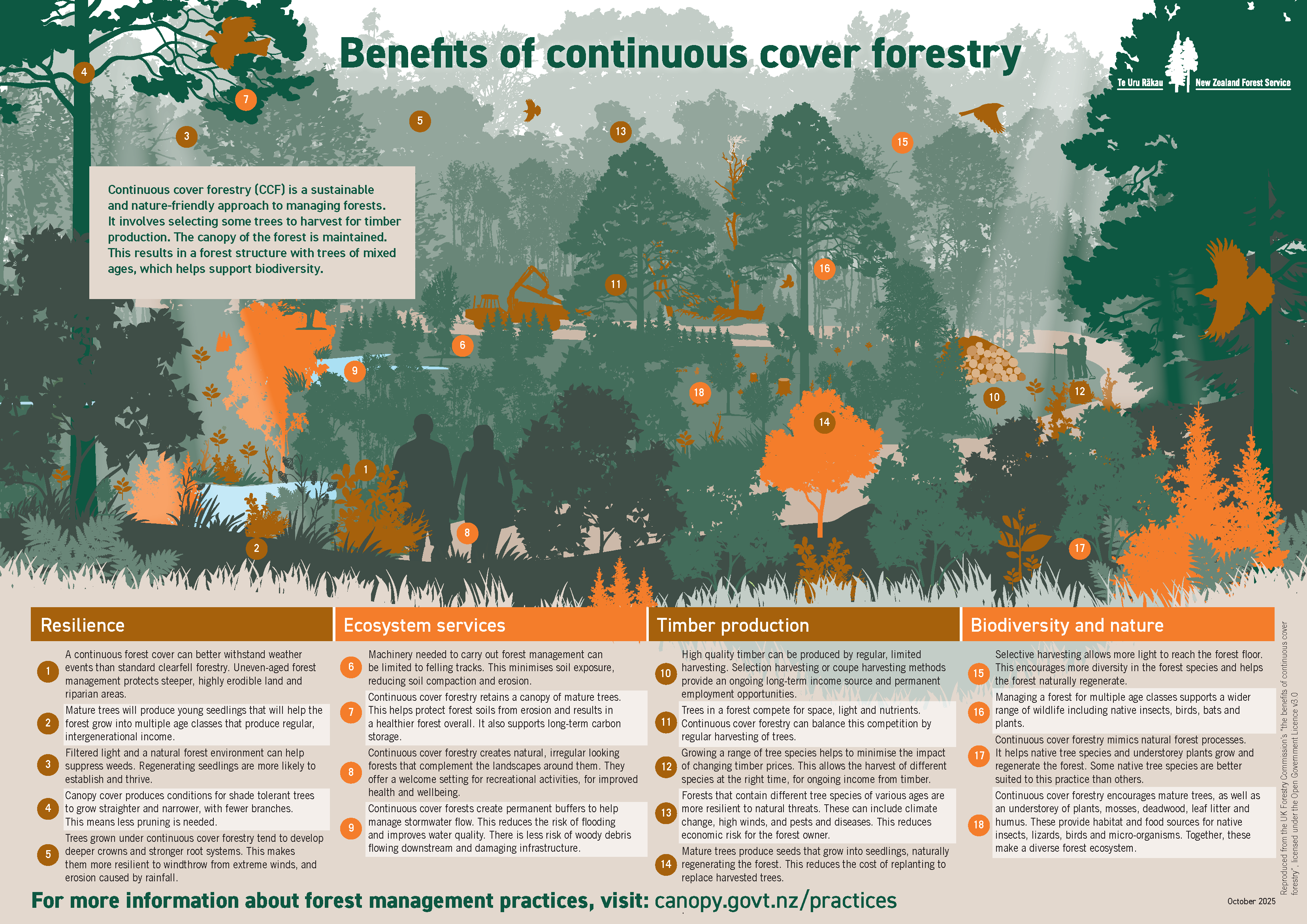 Continuous cover forestry (CCF) is a sustainable and nature-friendly approach to managing forests. It involves selecting some trees to harvest for timber production. The canopy of the forest is maintained. This results in a forest structure with trees of mixed ages, which helps support biodiversity.